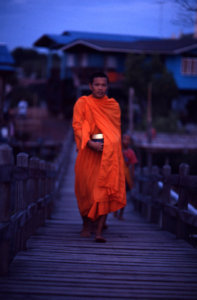 早朝、比丘は托鉢へ向かう前に水を浴びて身を清め、着衣の鬱金(うこん)の袈裟を整えて、首から前に大きな鉢を架け、肩には頭陀袋を下げて素足で信者の家々を廻る。
