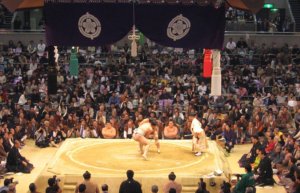 それは大相撲の土俵で、上から吊られた幕の東・西・南・北の四方から、緑・白・赤・黒の房が垂れ、真ん中に土(黄)俵がある。