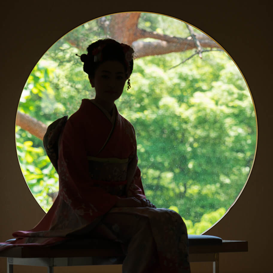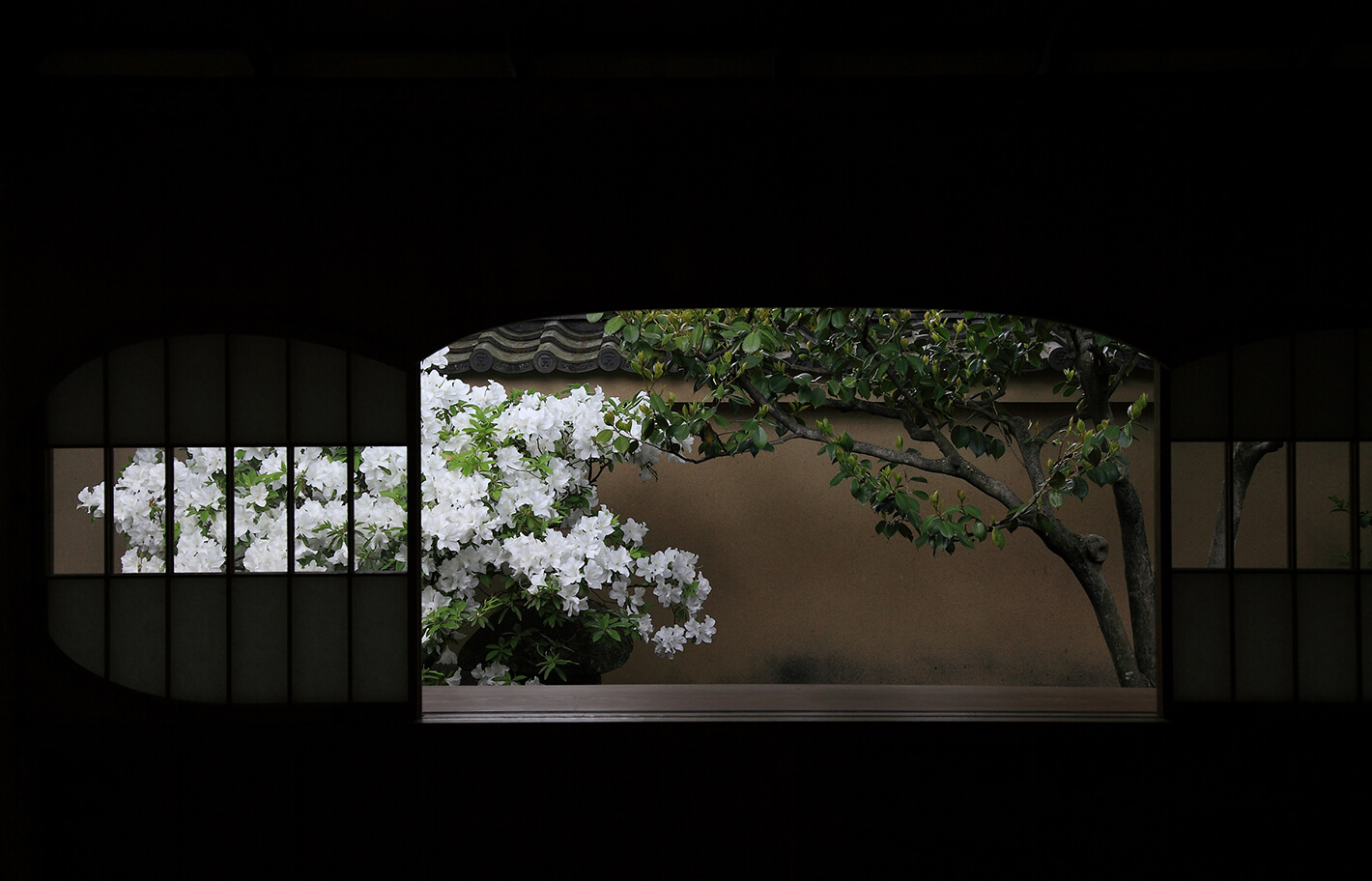 吉野窓/茶室に設けられた大円の窓であるが、真円ではなく、わずかに下部が直線となっている。これは、仏教、特に禅林では真円は真理の象徴であるが、吉野太夫は、決して完璧とはならぬ己を現すものとしての不完全な円をしつらえたとされる