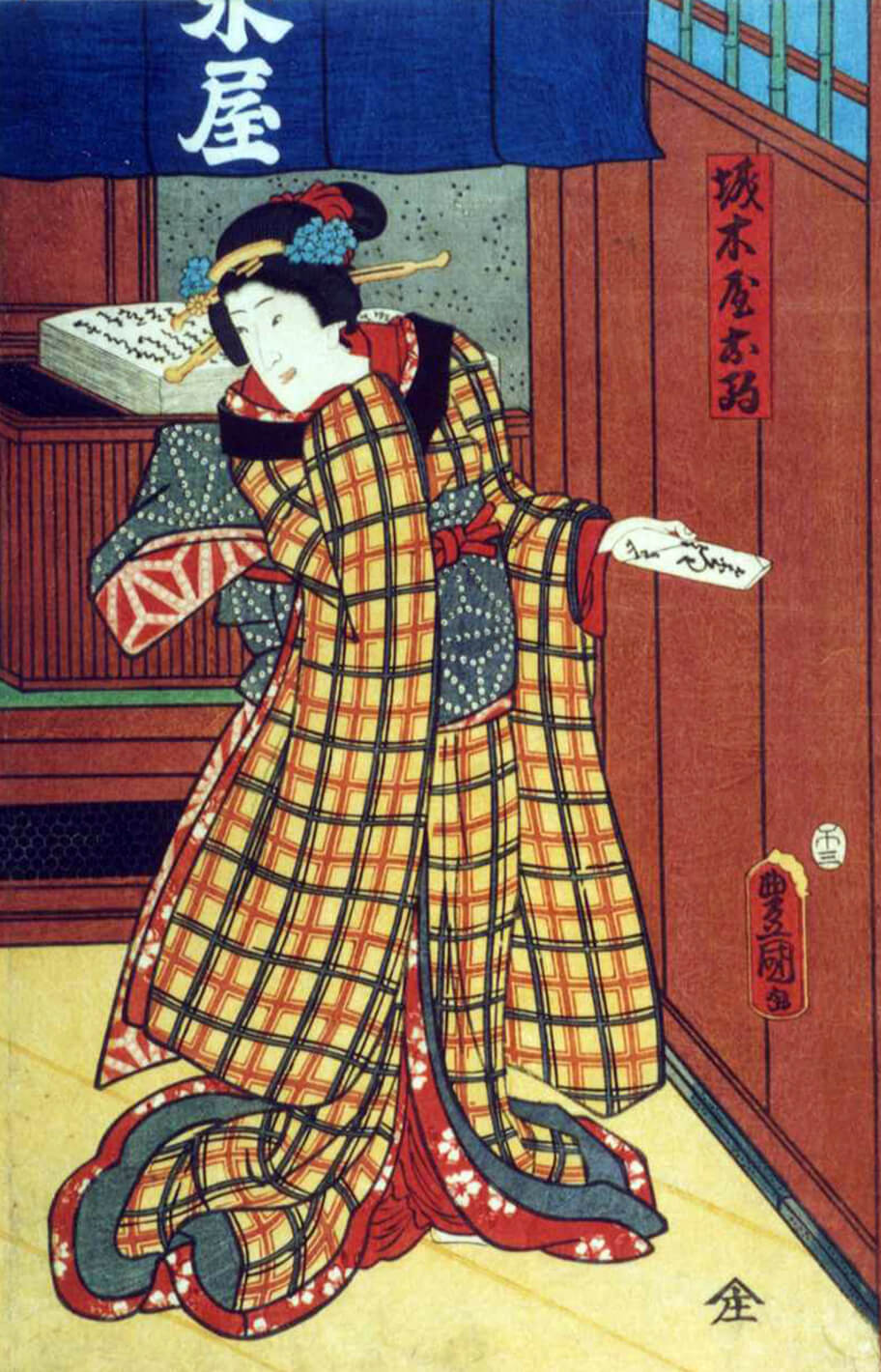 「城木屋お駒」歌川国貞画/早稲田大学演劇博物館蔵 衣装黄八丈